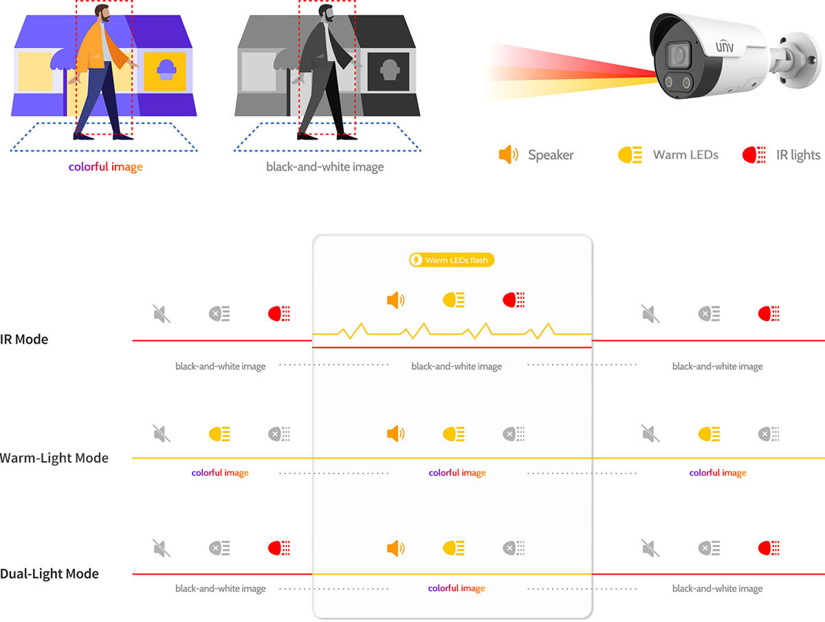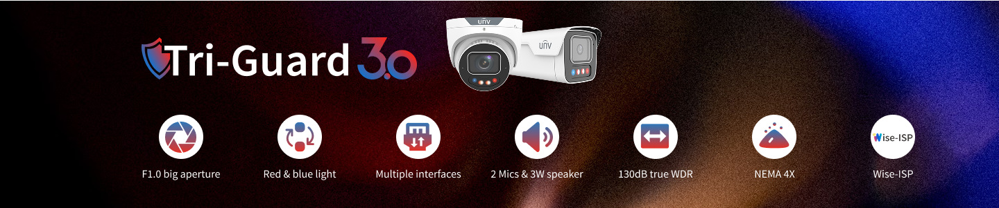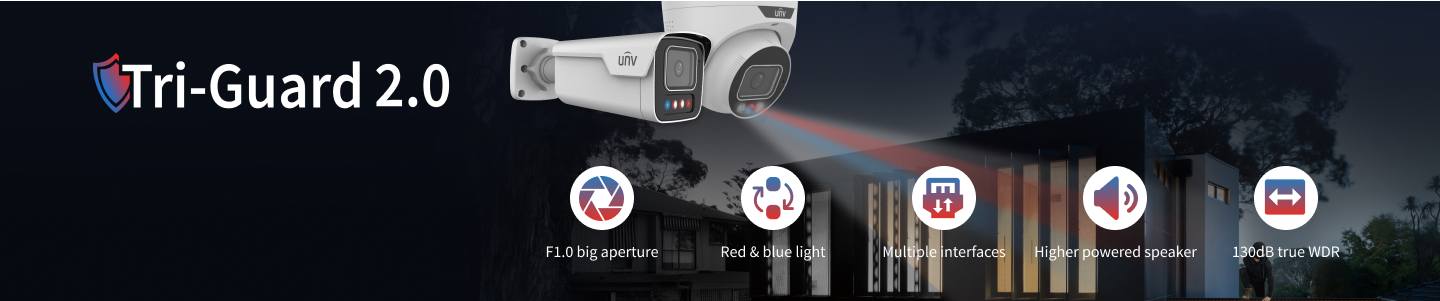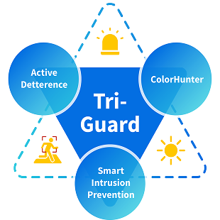 UNV Tri-Guard technology combines Smart Intrusion Prevention (SIP), ColorHunter, and Active Deterrence to prevent crimes at night. It not only alerts during events but also captures color details in low-light environments.