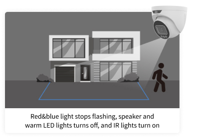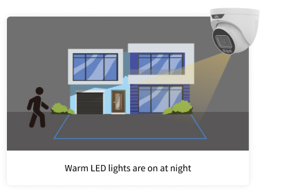 The lights remain off, providing better concealment for the camera. When a stranger enters, the lights turn on, allowing the camera to capture more details. Both Active Deterrence and ColorHunter are activated simultaneously.