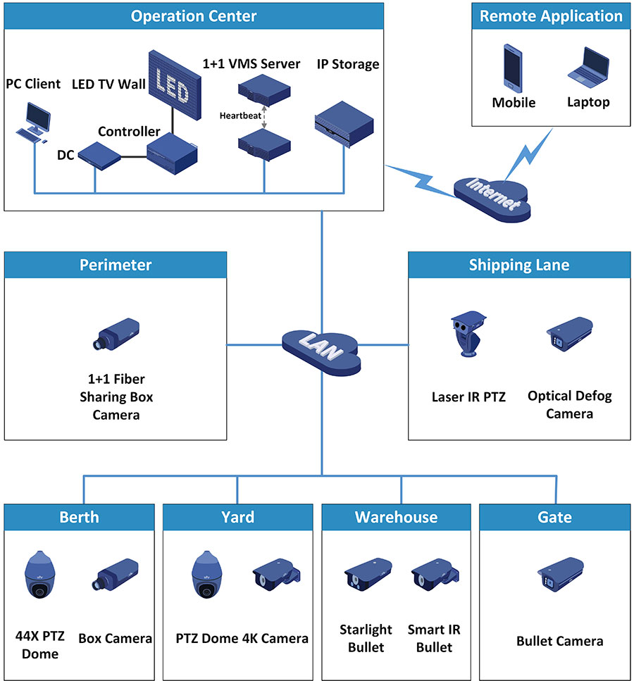 Uniview has been dedicated to video surveillance industry for years, accumulated much experience and knowledge in varied seaport projects. Uniview now present a comprehensive seaports surveillance solution which can be applied to all kinds of seaports surveillance project.