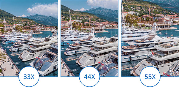 Up to 55X optical zoom, 300mm+ motorized lens