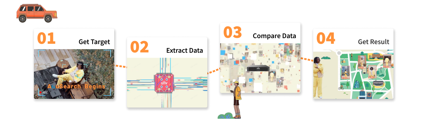 UNV AcuSearch adopts a brand-new video target search approach. Users only need to select the target object in the playback or live view interface by drawing a bounding box. The algorithm extracts corresponding targets based on the selected area, then analyzes the target type and extracts feature data.This information is then compared with existing data in the database, providing users with relevant historical data.