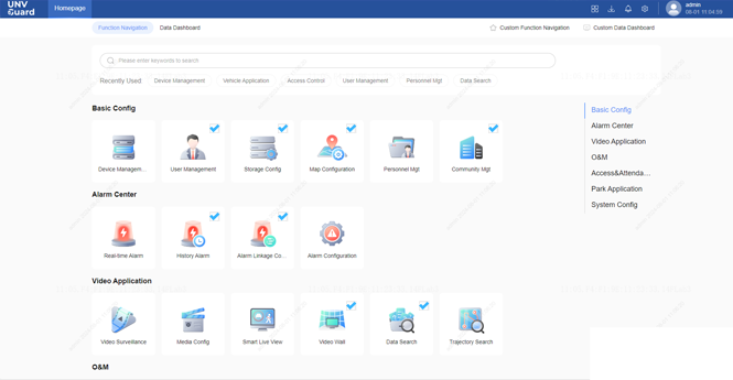 UNV Guard is a comprehensive security management platform that integrates multiple functions such as video surveillance, personnel management, access control management, and data search. The software adopts distributed deployment, is easy to use, and supports devices including encoding devices, decoders, access control devices, video intercom devices, etc. to provide a smart, comfortable, and safe visualized service for schools, residential buildings, supermarket, etc.